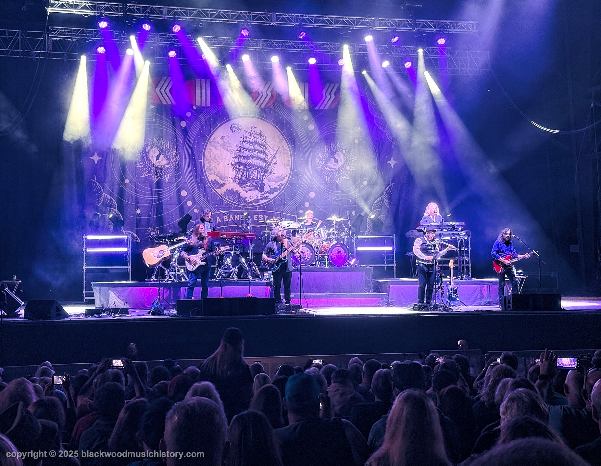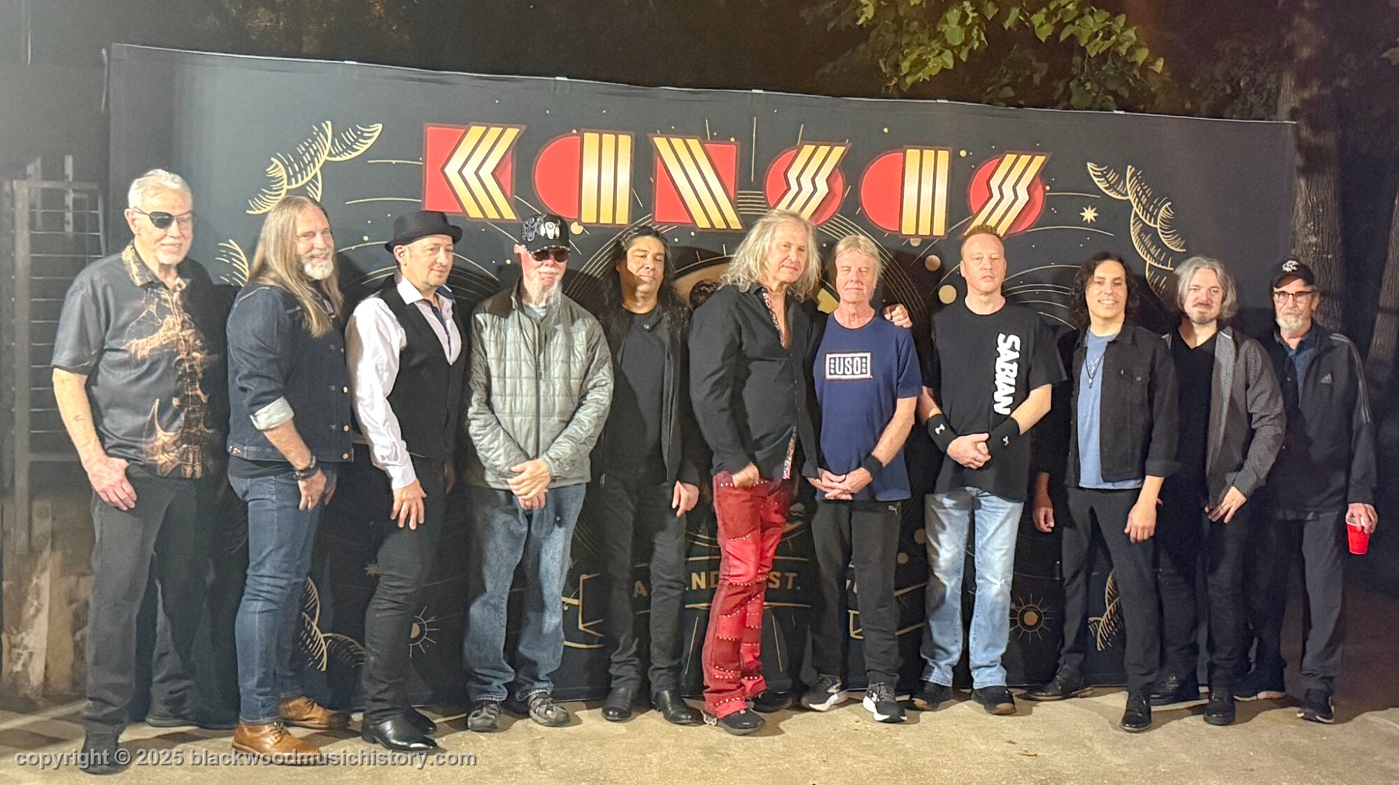 Current and original members of Kansas (l. to r.) Rich Williams, Eric Holmquist, Zak Rizvi, Tom Brislin, Phil Ehart, Ronnie Platt, Kerry Livgren, Dave Hope, Dan McGowan, Joe Deninzon, and Scott Bernard.
