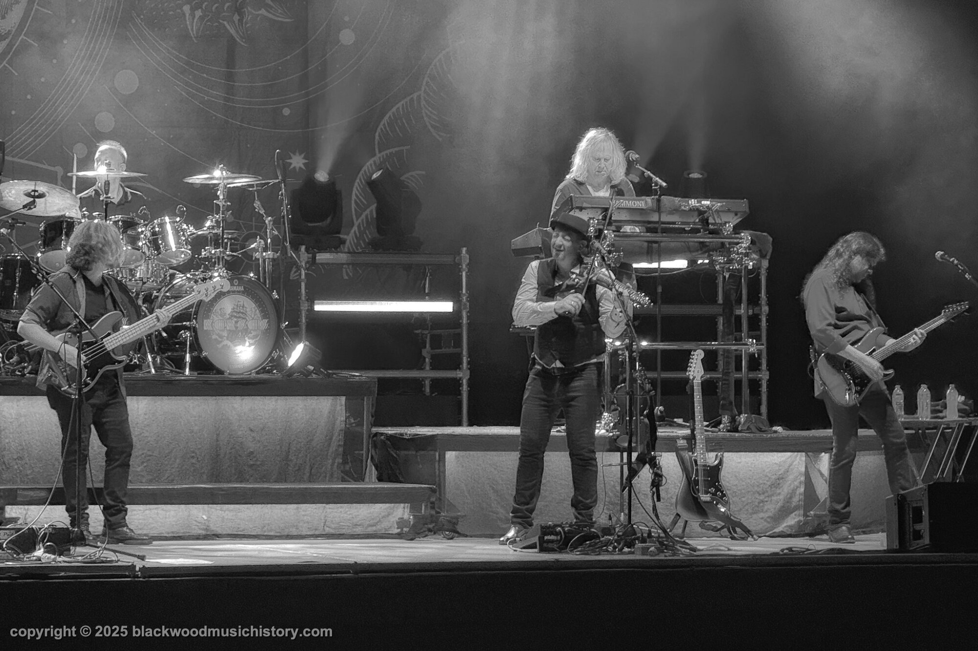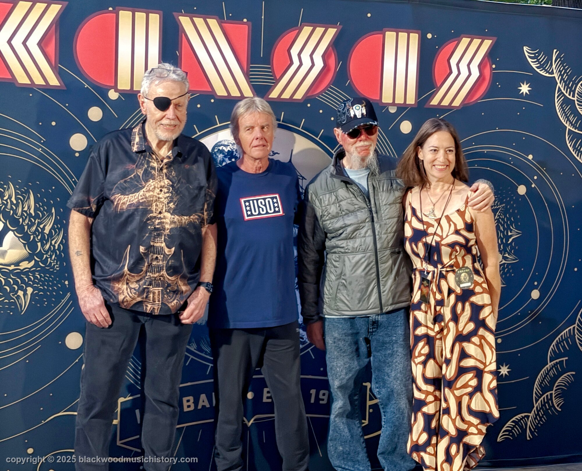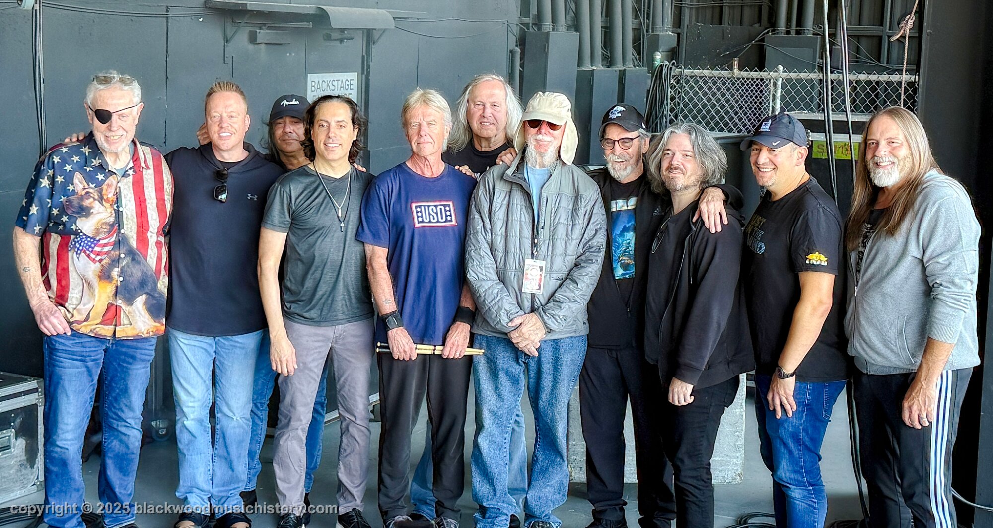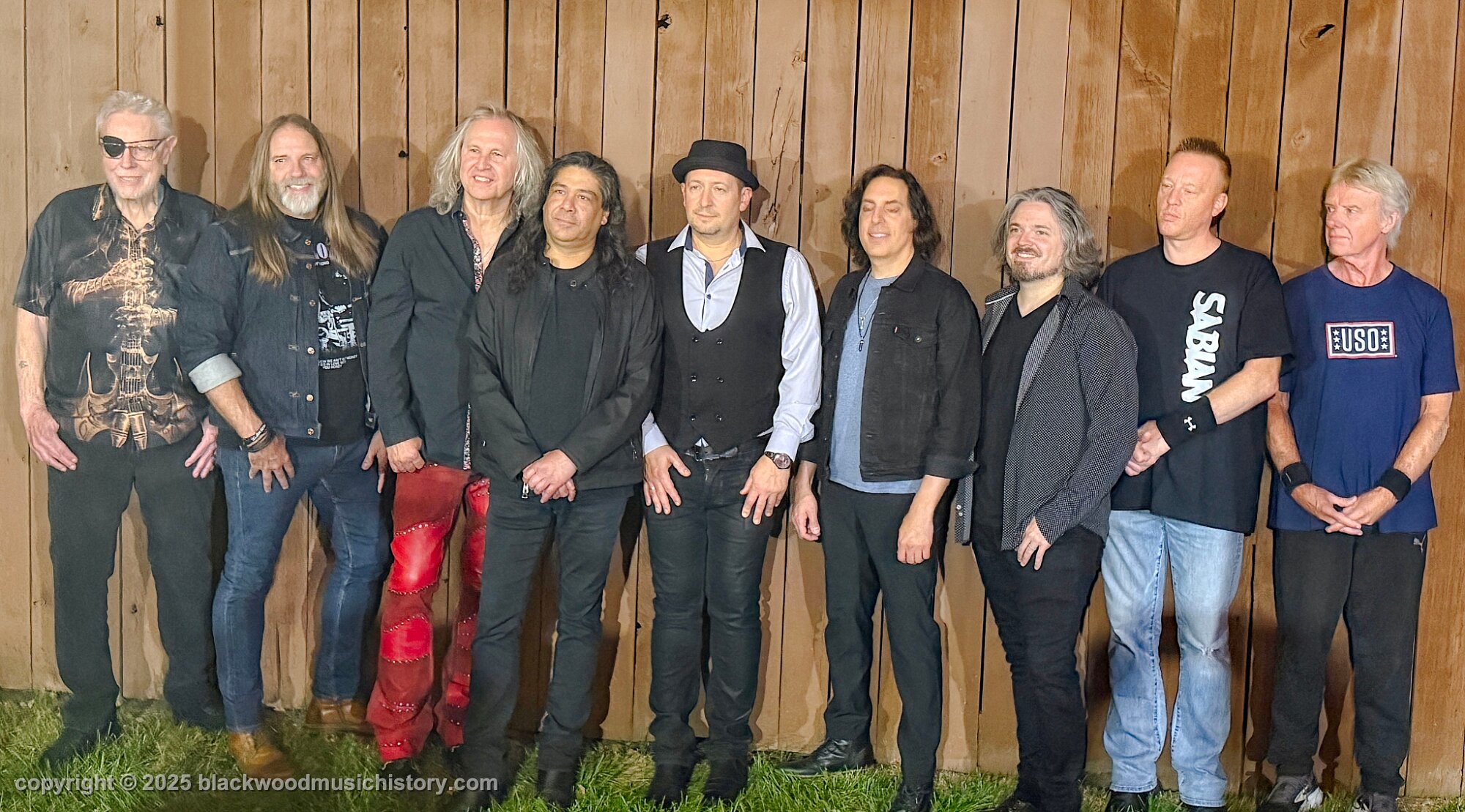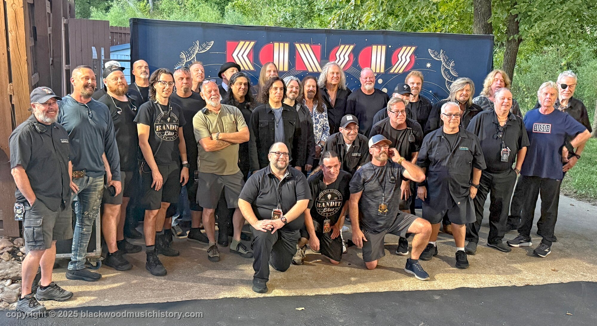 Current and original members of Kansas (l. to r.) Rich Williams, Eric Holmquist, Zak Rizvi, Tom Brislin, Phil Ehart, Ronnie Platt, Kerry Livgren, Dave Hope, Dan McGowan, Joe Deninzon, and Scott Bernard.